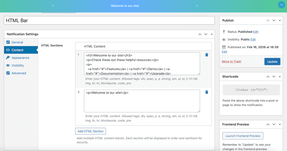 There are various HTML tags allowed, all of which can be used to create content for your bar. These include: div, strong, em, ul, h1-h6, img, br, blockquote, code, and so on. Each section of HTML works as the content for that slide.