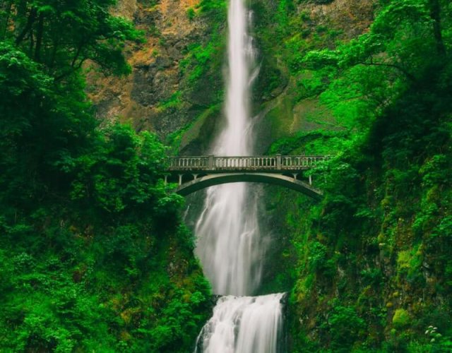A tall, powerful waterfall cascades down a cliffside, framed by lush green vegetation, with a bridge crossing above.